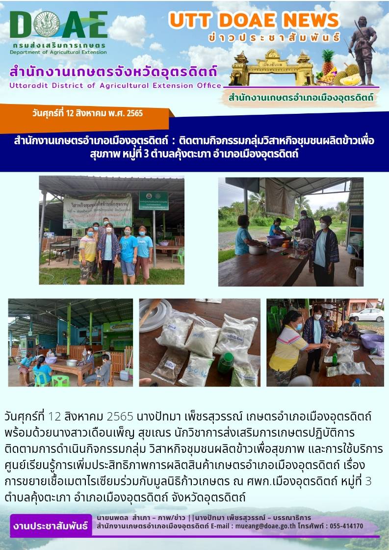 วันจันทร์ที่ 15 สิงหาคม 2565 เวลา 08.30 น. นางปัทมา เพ็ชรสุวรรณ์ เกษตรอำเภอเมืองอุตรดิตถ์ พร้อมด้วย นางศิรินทร์ เนาว์ชมภู นักวิชาการส่งเสริมการเกษตรชำนาญการ และนางสาวเดือนเพ็ญ สุขเณร นักวิชาการส่งเสริมการเกษตรปฏิบัติการ ร่วมประชุมเชื่อมโยงการดำเนินงานคณะกรรมการเครือข่าย ศพก. และแปลงใหญ่ ระดับอำเภอ ครั้งที่ 4/ 2565 ณ บ้านสวนประธานแปลงใหญ่ ผู้จัดการป…
