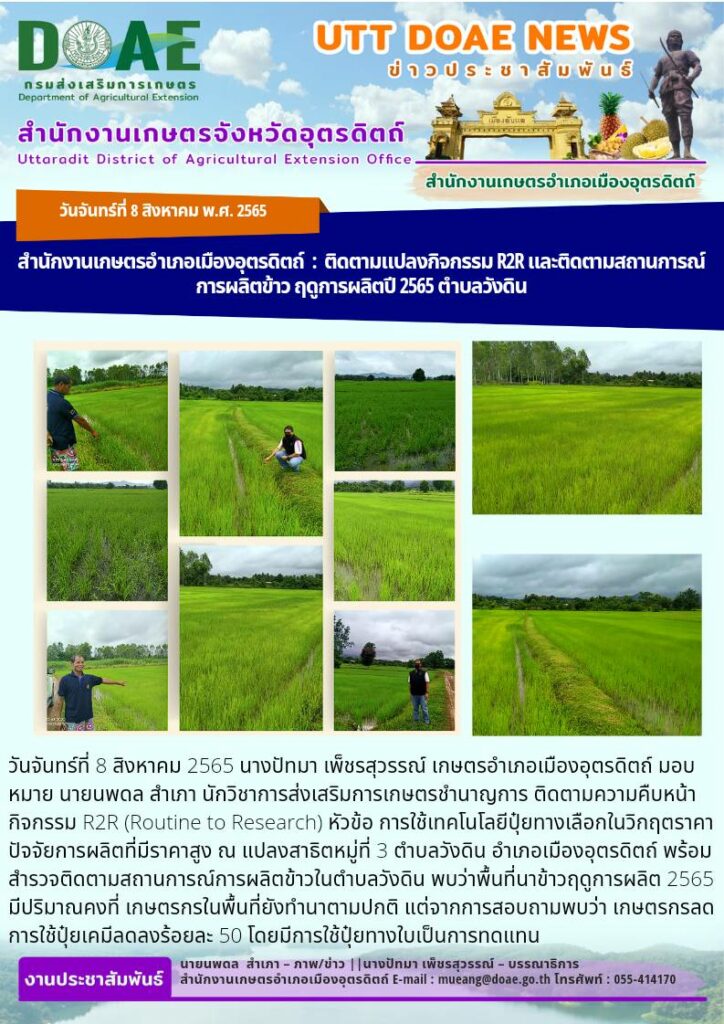 วันจันทร์ที่ 8 สิงหาคม 2565 เวลา 09.00 น. นางปัทมา เพ็ชรสุวรรณ์ เกษตรอำเภอเมืองอุตรดิตถ์ มอบหมายให้นายนพดล สำเภา นักวิชาการส่งเสริมการเกษตรชำนาญการ ติดตามความคืบหน้ากิจกรรม R2R (Routine to Research) หัวข้อการใช้เทคโนโลยีปุ๋ยทางเลือกในวิกฤตราคา ปัจจัยการผลิตที่มีคาคาสูง ณ แปลงสาธิต หมู่ที่ 3 ตำบลวังดิน อำเภอเมืองอุตรดิตถ์ พร้อมสำรวจติดตามสถานการณ์การผลิตข้าวในตำบลวังดิน พบว่าพื้นที่นาข้าวฤดูการผลิต 2565 มีปริมาณคงที่ เกษตรกรในพื้นที่ยังทำนาตามปกติ แต่จากการสอบถามพบว่าเกษตรกรลดการใช้ปุ๋ยเคมีลดลงร้อยละ 50 โดยมีการใช้ปุ๋ยทางใบเป็นการทดแทน